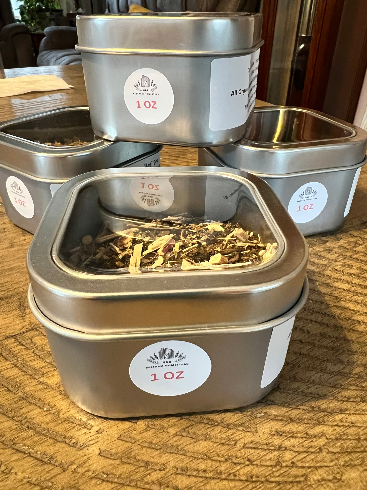 Tin can with clear view lid top …made with organic herbs of peppermint , Elderflower ,Rose hips, Ginger, Anise, Thyme,Yarrow, Calendula